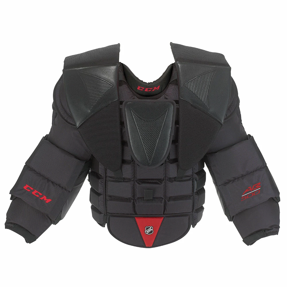 The CCM AB500 Chest and Arm Pads are a traditional design that is less bulky than other type of designs. A large coverage in shoulders provides a goalie for more coverage. A wider spine holds the chest protector and balances weight. While the JDP Technology(Joint Discharge Principle) disperses impact away from prone areas. While redesigned arm hinges offer more flexibility at the elbow to improve mobility and comfort.