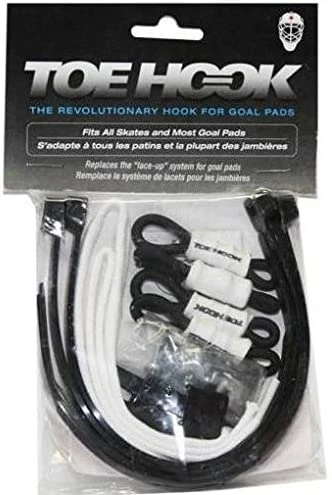 Most juniors will be able to attach their pads by themselves. Seniors will find less back and hip strain attaching their pads by using ToeHook. It fits nicely on most pads, using the holes vacated by those messy laces. The elastic extension can be secured to any make of goal or regular skate. ToeHook is made of 14-gauge stainless steel to resist bending. It is then coated with nylon to resist friction and wear during use. Heavy Duty elastic cord and tie wraps hold up to a goalie’s best saves. Butterfly goalies to standup goalies will find that the ToeHook stretches only when needed. Great feel and control are there for you, every time you wear the ToeHook.