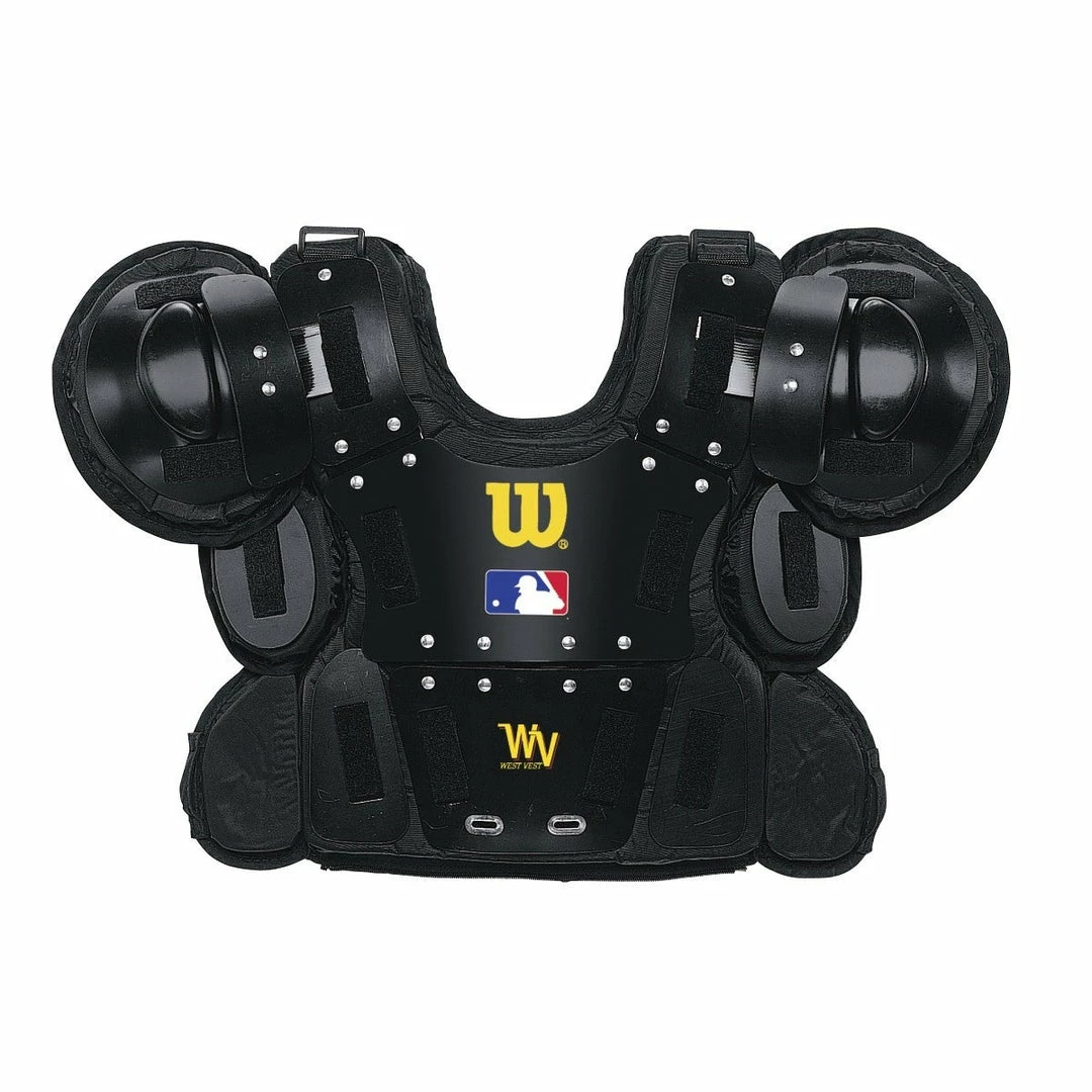 The ultimate in umpire protection, the West Vest Pro Gold Chest Protector has hinged shoulder plates for a tailored fit and extra side protection around the ribs for comfort and protection. The longer length provides more coverage than other chest protectors, and the removable pads make maintenance easy all season long.